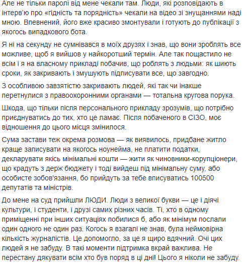 "Я не давал никаких показаний, руководствуясь 63 статьей Конституции Украины, а информация СМИ о том, что я будто бы кого-то назвал, является обычным вбросом... Как только я встретился с адвокатом, попросил сообщить людям правду о моем состояния. Мне важно было не вызывать сочувствия, а рассказывать историю такой, какая она есть, а она является ужасной в демократической стране 2018 года", - заключил он.