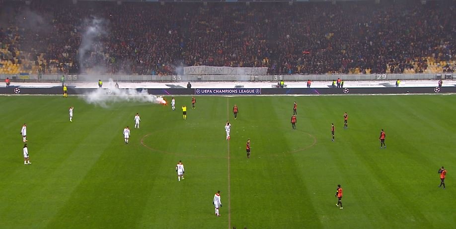 "Шахтар, вам тут не рады" - банер такого содержания можно было видеть на противоположной от ведущих трансляцию камер трибуне сразу после начала матча и прямо по середине поля во время исполнения гимна Лиги чемпионов, которым предваряется каждый поединок.