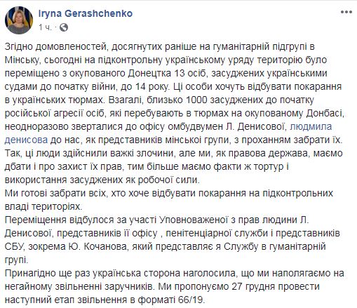 В свою очередь первый вице-спикер Верховной Рады, представитель Украины в гуманитарной подгруппе Трехсторонней контактной группы (ТКГ) Ирина Геращенко отметила, что эти 13 человек были осуждены украинскими судами еще до начала войны на востоке – еще до 2014 года и изъявили желание отбывать наказание в украинских тюрьмах.