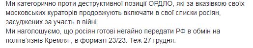"Это люди, которые получили приговоры судов еще до военной агрессии на востоке Украины. Осужденные сами изъявили желание отбывать наказание в украинских пенитенциарных учреждениях. Они, хотя и нарушили закон, но остаются гражданами Украины. И я как омбудсмен делаю все для обеспечения соблюдения прав всех украинцев, где бы они ни находились", - написала Денисова. Она вновь подчеркнула, что украинская сторона готова забрать всех заключенных, которые хотят продолжать отбывать наказание на подконтрольной правительству Украины территории.