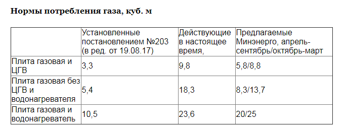 В Министерстве полагают, что норма потребления газа на одного человека для домохозяйств с газовой плитой и централизованным горячим водоснабжением (ЦГВ) должна составлять 5,8 куб. м на период с апреля по сентябрь, и 8,8 куб. м на период с октября по март.