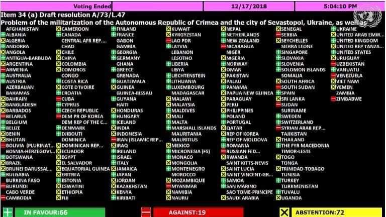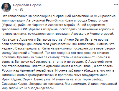 "Как видите Армения и Беларусь против. А чего бы им быть не против, если поставщик дешевого газа указывает им, как голосовать. Помню, что недавно Бацька предлагал быть независимым посредником в переговорах между Украиной и Россией. Так вот, глядя на это голосование хочется пожелать Лукашенко сначала самому стать независимым от Кремля и вернуть Беларуси субъектность, а тогда и поговорим. С Арменией тоже все стало понятно. Власть в Армении может и поменялась, а вот власть России над Арменией незыблема. И очень забавно наблюдать, что они в компании самых демократических и прогрессивных государств мира - Иран, Судан, Сирия, Венесуэла. И вишенка на этом торте свобод - Северная Корея. Интересная компашка. Мы запомним. И цивилизованный мир запомнит. И выводы сделаем", - подчеркнул Береза.