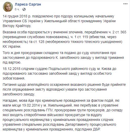 "18.12.2018 следственным судьей Подольского районного суда г. Киева к подозреваемому применена мера пресечения в виде личного обязательства", - сообщила она. Пресс-секретарь генпрокурора заявила, что 14 декабря Крайтору было сообщено о подозрении в совершении преступлений, предусмотренных ч. 2 ст. 365 (превышение служебных полномочий), ч. 1 ст. 119 (убийство по неосторожности) и ст. 128 (неосторожное тяжкое или средней тяжести телесное повреждение) Уголовного кодекса. "В тот же день прокурорами было составлено и подано в суд ходатайство о применении к подозреваемому К. меры пресечения в виде содержания под стражей", - рассказала Сарган.