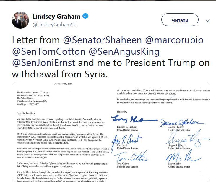 Группа сенаторов США написала официальное письмо Белому дому, в котором осуждается решение Трампа вывести американский воинский контингент из Сирии.