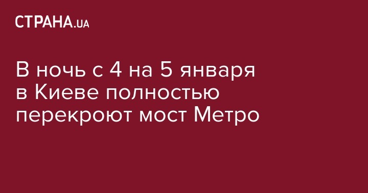 В ночь с 4 на 5 января будет закрыто движение транспорта по мосту Метро через Русановский пролив. Об этом сообщили в пресс-службе КК "Киевавтодор".