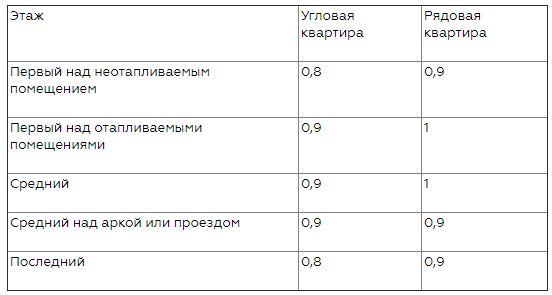 Методика также предусматривает применение поправочных коэффициентов для распределения объема потребленной тепловой энергии между потребителями в угловых квартирах, квартирах, расположенных на первых и последних этажах зданий и т.п. Поправочные коэффициенты рассчитываются на основе проектных величин теплопотерь помещений для каждого отдельного здания. В случае отсутствия проектных данных по теплопотерям отдельного здания или аналогичных зданий используются упрощенные поправочные коэффициенты, применяемые для каждой квартиры: