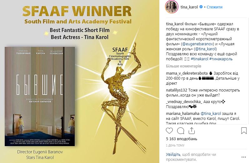 "Фильм "Бывшие" одержал победу на кинофестивале SFAAF сразу в двух номинациях. Поздравляю всю команду с еще одной победой! – написала Тина Кароль. За мастерское воплощение непростой истории молодой женщины Тина Кароль получила награду кинофестиваля SFAAF в номинации "Лучшая женская роль". Кроме этого, награду получил и режиссер киноленты Евгений Баранов.