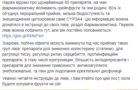 По словам Супрун, грейпфрут, помело, лаймы и горькие апельсины ускоряют попадание лекарственных препаратов в кровь, (биодоступность), что приводит к серьезным последствиям для организма человека.