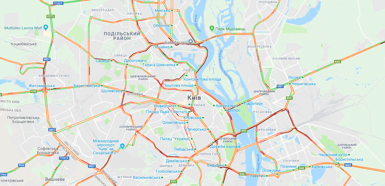 Также затруднено движение в обе стороны по Кольцевой дороге на участке от Одесской площади до пересечения с проспектом Победы. Медленно передвигаются автомобили и по самому проспекту, почти парализовано движение на участке от станции метро "Шулявская" до "Брестской".
