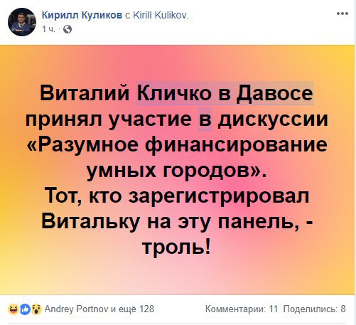 Кирилл Куликов отмечает, что Кличко поехал в Давос, чтобы участвовать в панельной дискуссии "Разумное финансирование умных городов."Тот, кто зарегистрировал Витальку на эту панель - троль", - написал она.