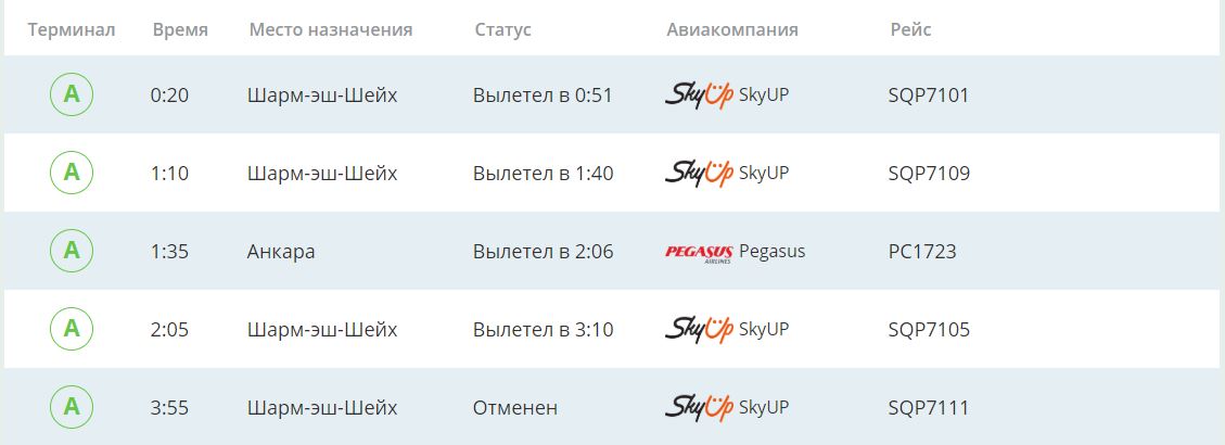 В аэропорту "Киев" (Жуляны) самолеты на Шарм-эш-Шейх, Анкару, Одессу хоть и с задержкой, но вылетели. Отменен был лишь один из рейсов на Шарм-эш-Шейх на 03:55.