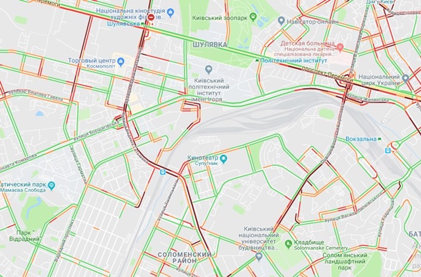 Днем в пятницу, 25 января, Соломенский район Киева застыл в пробках. Об этом свидетельствуют данные сервиса Videoprobki.ua.