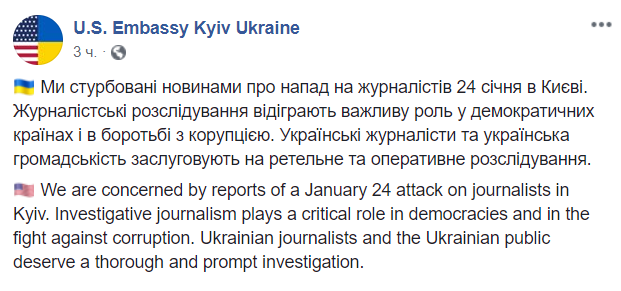 "Мы обеспокоены новостями о нападении на журналистов 24 января в Киеве. Журналистские расследования играют важную роль в демократических странах и в борьбе с коррупцией. Украинские журналисты и украинская общественность заслуживают тщательного и оперативного расследования", - говорится в сообщении.