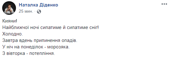Ближайшей ночью, 27 января, в Киеве ожидается сильный снегопад и трескучие морозы. Об этом сообщает синоптик Наталья Диденко на своей странице в Facebook.