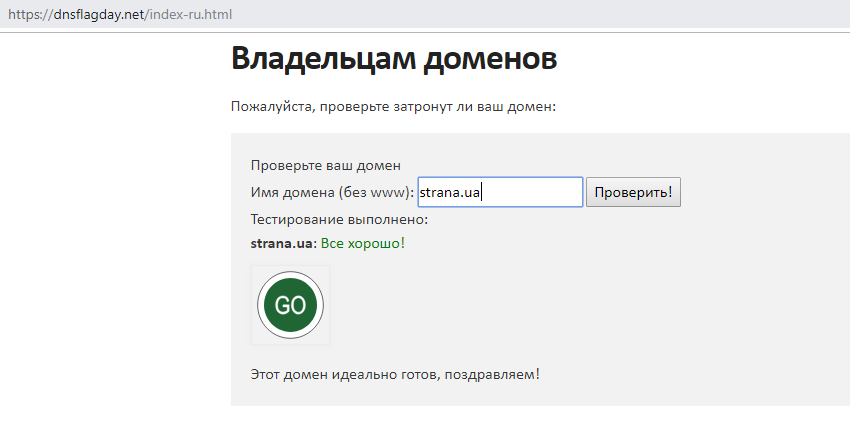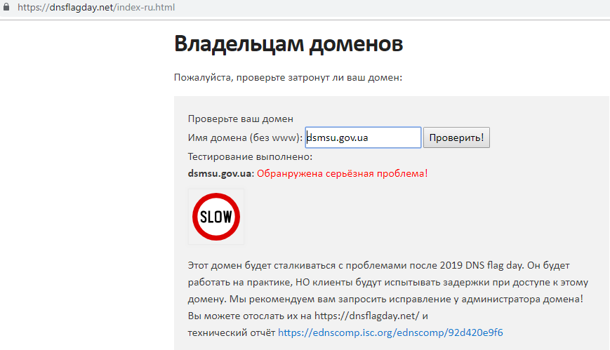 Чтобы узнать, поддерживает ли ваш ресурс EDNS, можно пройти быструю проверку на сайте DNS flag day: в специальное поле необходимо ввести адрес.