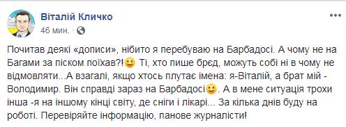Кстати, и сам Виталий Кличко в Facebook опроверг "барбадосскую" версию своего пребывания. "Вообще, если кто-то путает имена: я - Виталий, а брат мой - Владимир. Он действительно сейчас на Барбадосе", - сообщил Кличко в Facebook. Он обещает через несколько дней быть на работе.