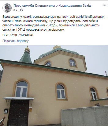 "С сегодняшнего дня в храме, расположенном на территории одной из воинских частей Ровенского гарнизона, что в зоне ответственности войск оперативного командования "Запад", прекратили свою деятельность служители УПЦ (Московского патриархата)", - сообщила пресс-служба.