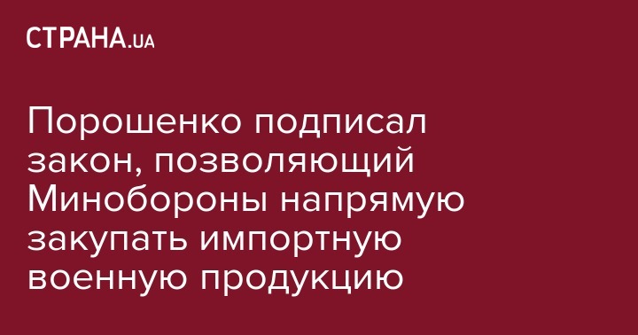 Президент Украины Петр Порошенко подписал закон № 2672-VIII, который предоставляет право Министерству обороны заключать международные договора об импорте военной продукции. Об этом сообщается на сайте главы государства.