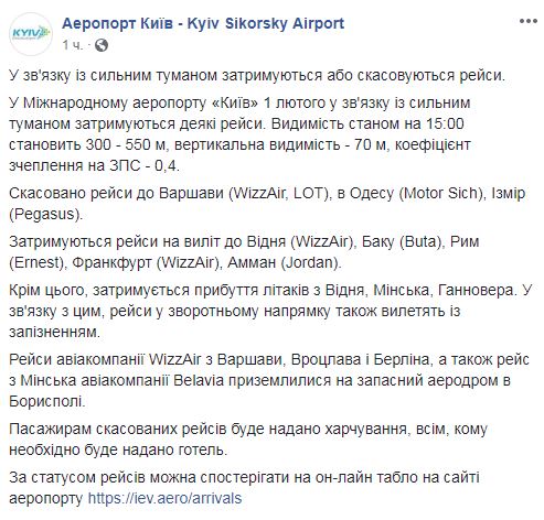 Уже отменены рейсы в Варшаву (WizzAir, LOT), в Одессу (Motor Sich), Измир (Pegasus). Рейсы на вылет задерживаются в Вену (WizzAir), Баку (Buta), Рим (Ernest), Франкфурт (WizzAir), Амман (Jordan). Также задерживается прибытие самолетов из Вены, Минска, Ганновера. В связи с этим, авиабилеты в обратном направлении также вылетят с опозданием. Рейсы авиакомпании WizzAir из Варшавы, Вроцлава и Берлина, а также рейс из Минска авиакомпании Belavia приземлились на запасной аэродром в Борисполе.