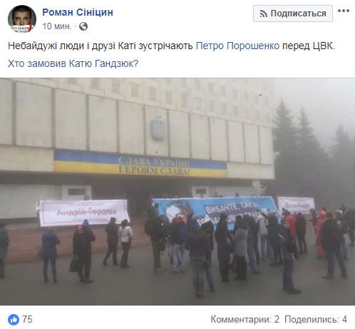 Ее участники встречают Петра Порошенко, которого ждут сегодня в ЦИК для подачи документов, под лозунгами: "Кто заказал Катю Гандзюк".