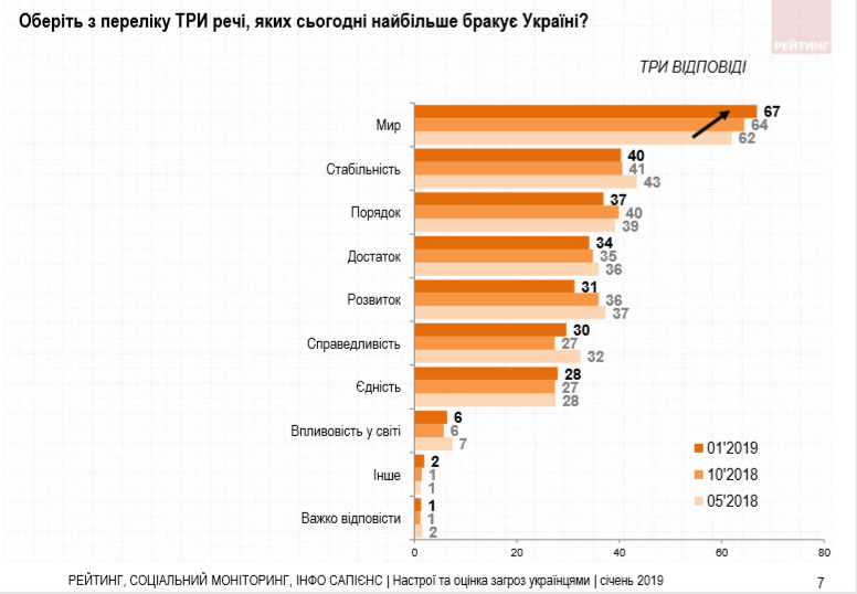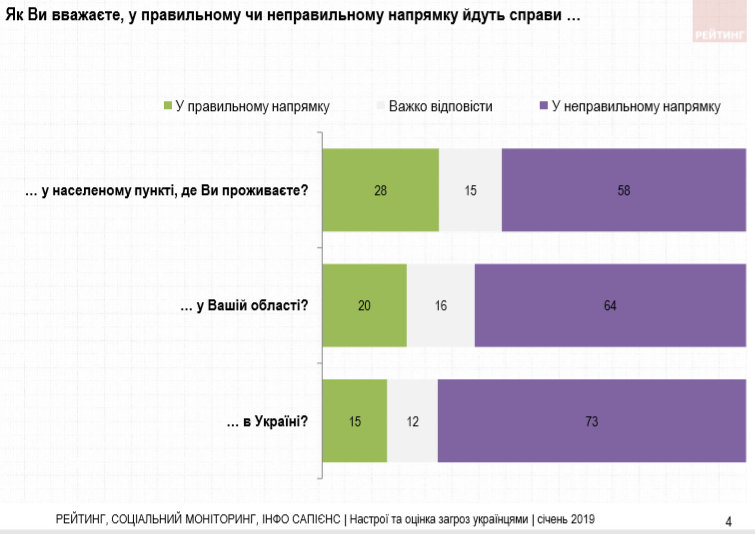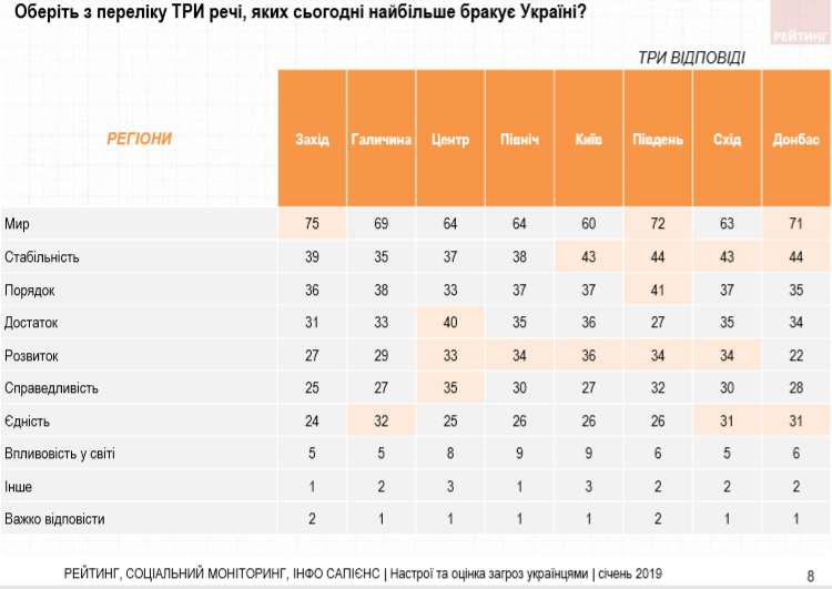 В оценках направления развития на местном уровне также преобладает негативная оценка. Так, 64% опрошенных считают неправильным направление развития Киевской области (только 20% - правильным). 58% негативно оценивают состояние дел в населенном пункте, где проживают (28% - положительно). По мнению большинства опрошенных (67%) мир есть то, чего сегодня больше всего не хватает Украине, при этом за последние полгода этот показатель вырос с 62 до 67%. 40% считают, что государству больше всего не хватает стабильности, еще 37% - порядка 34% - достатка, 31% - развития, по 28-30% - единства и справедливости. Вопрос мира является актуальным для Запада, Юга и Донбасса, вопрос стабильности - для столичного региона и юго-восточных областей, развития - для Центра, Севера, Юга и Востока, единства - для Галичины и Донбасса. Вопрос порядка, справедливости и достатка более или менее одинаково актуален для респондентов практически во всех макрорегионах.