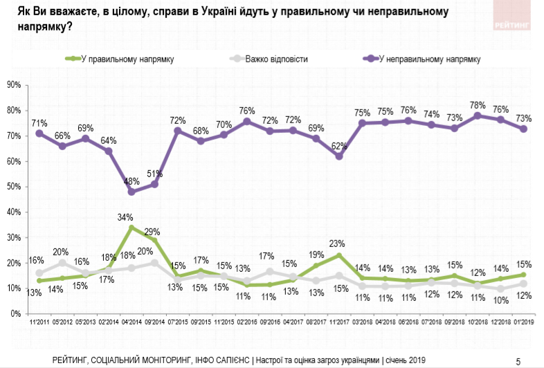 73% украинцев считают, что страна движется в неправильном направлении, только 15% убеждены, что направление развития государства правильное. Об этом свидетельствуют результаты опроса, проведенного Центром "Социальный мониторинг", "Украинским институтом социальных исследований им. Яременко", компанией "Инфо Сапиенс" и Социологической группой "Рейтинг".