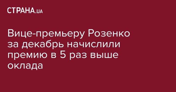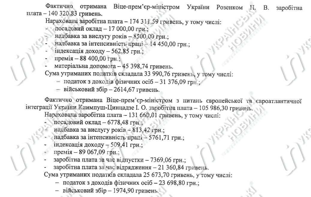 Согласно ему, Розенко было начислено за декабрь 174 312 гривен, из них должностной оклад составил 17 000 гривен, надбавка за выслугу лет - 8 500 гривен, надбавка за интенсивность труда - 14 450 гривен, индексация - 563 гривни, премия - 88 400 гривен, материальная помощь - 45 399 гривен. Сумма удержанных налогов составила 33 991 гривню. Фактическая сумма средств, полученная вице-премьером, составила 140 321 гривню.