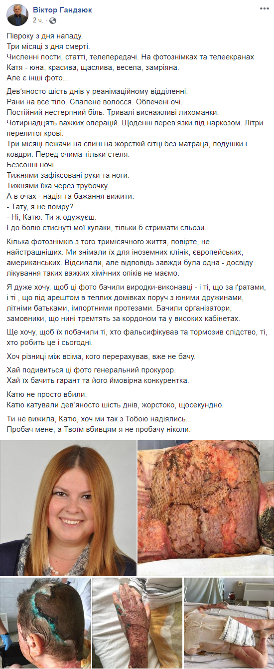 "Полгода со дня нападения. Три месяца со дня смерти. Многочисленные посты, статьи, телепередачи. На фотоснимках и телеэкранах Катя - юная, красивая, счастливая, веселая, мечтательная. Но есть другие фото... Девяносто шесть дней в реанимационном отделении. Раны на все тело. Сожженные волосы. Обожженные глаза. Постоянная невыносимая боль. Длительные изматывающие лихорадки. Четырнадцать тяжелых операций. Ежедневные перевязки под наркозом. Литры перелитой крови. Три месяца лежания на спине на жесткой сетке, без матраца, подушки и одеяла. Перед глазами только потолок. Бессонные ночи. Неделями зафиксированы руки и ноги. Неделями еда через трубочку. А в глазах - надежда и желание выжить", - написал он.