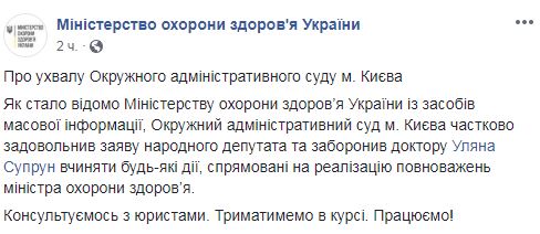 В Минздраве Украины сообщили, что узнали из СМИ про решение окружного административного суда Киева запретить исполнять обязанности и.о. главы ведомства Ульяне Супрун. Об этом сказано на странице министерства в Facebook.
