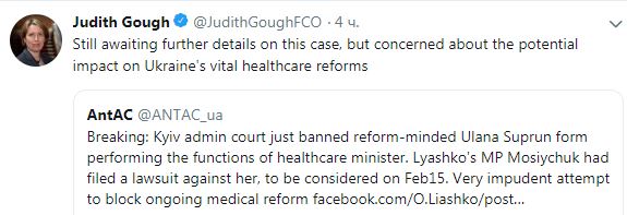 Посол Великобритании в Украине Джудит Гоф обеспокоена возможным влиянием решения суда об отстранении от должности и.о. министра здравоохранения Украины Ульяны Супрун на реформу здравоохранения. Об этом посол написала на своей странице в микроблоге Twitter во вторник.