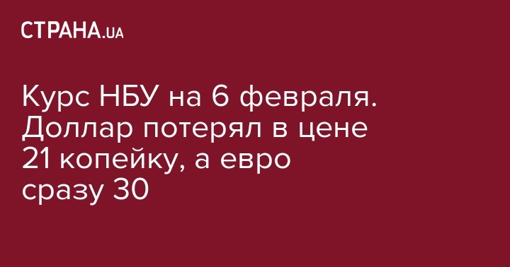 Так, НБУ установил курс доллара на уровне 27,21 грн/$, то есть на 21 копейку дешевле, чем вчера, 5 февраля. Евро сегодня стоит 31,08 грн за единицу - на 30 копеек меньше, чем днем ранее.