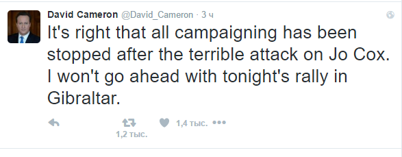 "Я считаю правильным шагом полную приостановку кампании после чудовищного нападения на Джо Кокс", — говорится в сообщении.