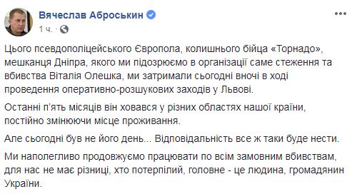 "Этого псевдополицейского Европола, бывшего бойца "Торнадо", жителя Днепра, которого мы подозреваем в организации именно наблюдения и убийства Виталия Олешко, мы задержали сегодня ночью в ходе проведения оперативно-розыскных мероприятий во Львове", - написал он. Подозреваемый 5 месяцев скрывался от следствия в разных регионах страны.