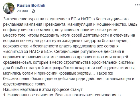 Политолог Руслан Бортник: "Закрепление курса на вступление в ЕС и НАТО в Конституции– это рекламная кампания Президента, манипуляция и мошенничество. Ведь по факту ничего не меняет, но усиливает политические риски. Вместо того, чтобы подводить итоги своей деятельности и отвечать на вопросы почему не достигнуты западные стандарты благополучия, верховенства и безопасности власть предложила все сегодня "молиться за НАТО и ЕС". Сегодняшние ритуальные действия в парламенте напоминают мне шаманов древних инков или лекарей средневековья, которые вместо строительства оросительной системы для борьбы с засухой или разработки лекарств и соблюдения гигиены, молились богам и приносили кровавые жертвы… Такое же бессмысленно беспощадное действие ради действия, отвлекающее и фрустрирующее толпу.