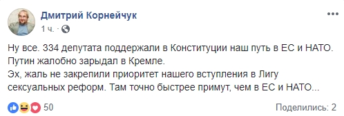 "Ну все. 334 депутата поддержали в Конституции наш путь в ЕС и НАТО.