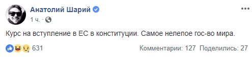 "Депутаты проголосовали за курс на ЕС и НАТО в Конституции. Уходящий президент со своей командой делает все, чтобы война не прекратилась. Пока лишь отмечу, что весомую роль в наборе 300 голосов сыграла подконтрольная Ринату Ахметову фракция Олега Ляшко. Главный радикал еще во вторник грозился вообще ни за что не голосовать пока не отправят в отставку руководство "Нафтогаза". Два дня прошло - проголосовал.