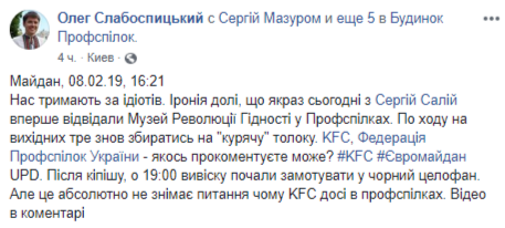 Фото"Но вопрос наличия KFC в профсоюзах это не снимает. Такое впечатление, что проверяют отреагируют люди или нет", - написал Слабоспицкий.