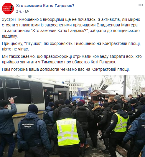 Также сообщается, что перед началом встречи лидера "Батькивщины" Юлии Тимошенко с избирателями на Контрактовой площади в Киеве полиция задержала активистов, которые стояли с плакатом "Кто заказал Катю Гандзюк?". Всех задержанных доставили в Подольское отделение полиции.