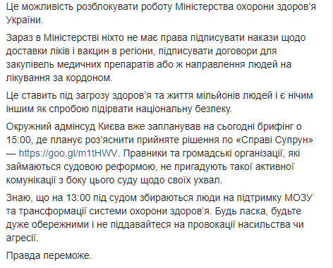 Отметим, что команда Супрун рассматривает сегодняшнее заседание в суде как возможность разблокировать работу Министерства здравоохранения Украины. "Сейчас в Министерстве никто не имеет права подписывать приказы по доставке лекарств и вакцин в регионы, подписывать договоры для закупок медицинских препаратов или же направления людей на лечение за рубежом. Это ставит под угрозу здоровье и жизнь миллионов людей и является ничем иным как попыткой подорвать национальную безопасность", - говорится на странице Супрун в Facebook.