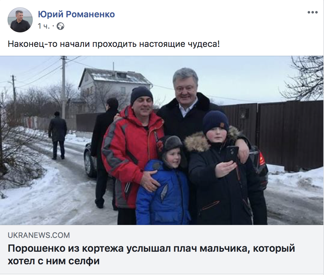 Президент Украины Петр Порошенко вышел из кортежа, после того, как услышал плач ребенка, который хотел сделать с ним селфи. Об этом написала первый заместитель председателя Верховной Рады Ирина Геращенко на своей странице в соцсети Facebook.