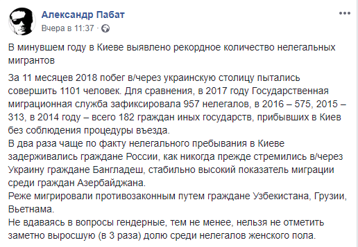 "За 11 месяцев 2018 побег в/через украинскую столицу пытались совершить 1101 человек. Для сравнения, в 2017 году Государственная миграционная служба зафиксировала 957 нелегалов, в 2016 – 575, 2015 – 313, в 2014 году – всего 182 граждан иных государств, прибывших в Киев без соблюдения процедуры въезда." , – отметил Пабат.