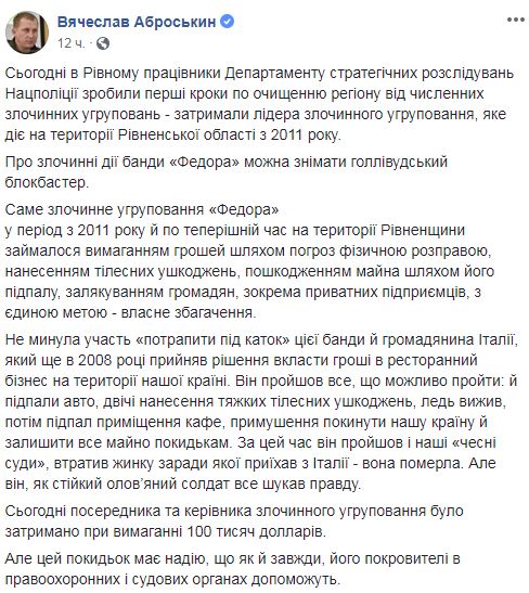 В Ровно задержали лидера "банды Федора", которая действовала на территории Ровенской области с 2011 года. Об этом сообщил первый заместитель главы Национальной полиции Вячеслав Аброськин в Facebook.