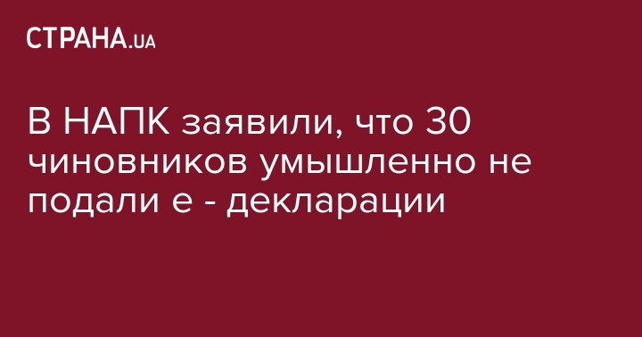 Национальное агентство по вопросам предотвращения коррупции (НАПК) выявило признаки умышленного непредставления е-деклараций 30 должностными лицами Национальной полиции, Национального банка, Министерства юстиции и других госорганов. Об этом передает пресс-служба НАПК.