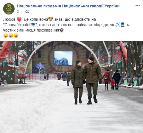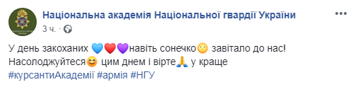 В четверг, 14 февраля, курсанты Национальной академии Национальной гвардии Украины поздравили всех с Днем Святого Валентина. Об этом свидетельствуют сообщения на странице академии в Facebook.