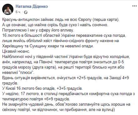 "16 февраля в большинстве областей Украины будет преобладать сухая погода, лишь какой-то облезлый хвост северо-восточного фронта нагонит в Харьковскую и Сумскую области облака и небольшие осадки. Интересный нюанс. Ближайшей ночью в южной части Украины будет ощутимо холоднее, чем, например, на Севере: температура воздуха снизится до 0-5 градусов мороза (вторая карта), на остальной территории около ноля или небольшие "плюсы", - обещает Наталья Диденко.