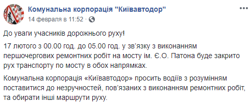 В Киеве сегодня ночью, 17 февраля, движение по мосту Патона полностью перекроют в связи с выполнением первоочередных ремонтных работ. Об этом сообщает пресс-служба корпорации "Киевавтодор" в Facebook.