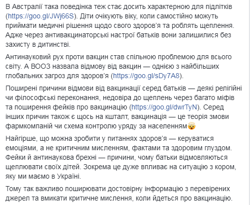 "Распространенные причины отказа от вакцинации среди родителей - некоторые религиозные или философские убеждения, недоверие к прививкам много мифов и распространение фейков о вакцинации. Среди других причин также является то, что вроде, вакцинация - это теория заговора фармкомпаний или схема контроля правительства за населением", - говорится в опубликованном сообщении и.о. министра здравоохранения.