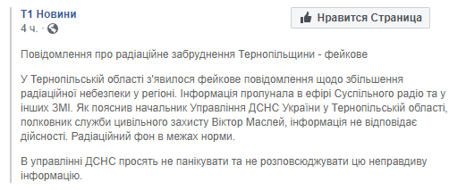 "В средствах массовой информации появилось сообщение о радиационной опасности. Данная информация является фейком. Радиационная ситуация в области в норме", - написал он в Facebook.