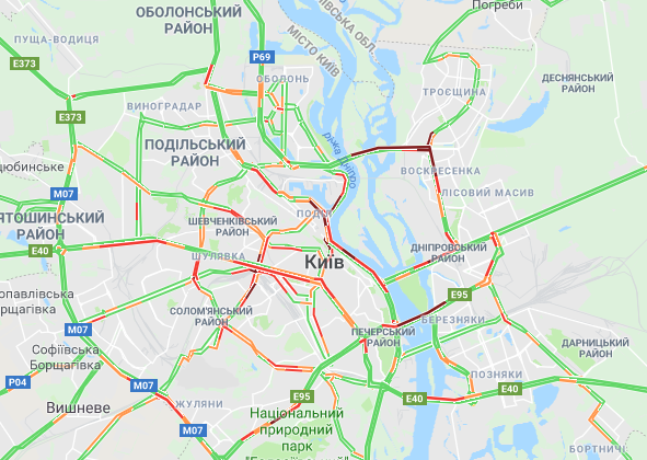 Многочисленные пробки наблюдаются на улице Михаила Грушевского, Большой Васильковской, Сечевых Стрельцов, Набережно-Рыбальской, бульваре Леси Украинский, улице Антоновича, Степана Бандеры, Петра Сагайдачного, Глыбочицкой, Вячеслава Черновола, Бессарабской площади и Надднепрянском шоссе, на Нижнем Валу и проспекте Леся Курбаса.