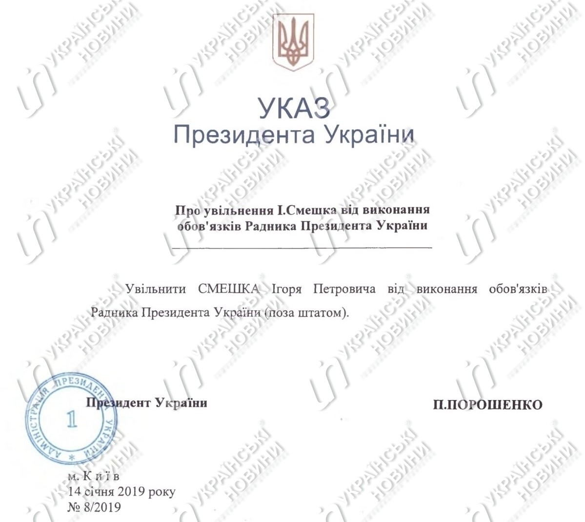 "Освободить Смешко Игоря Петровича от исполнения обязанностей советника президента Украины (вне штата)", - сказано в нем.